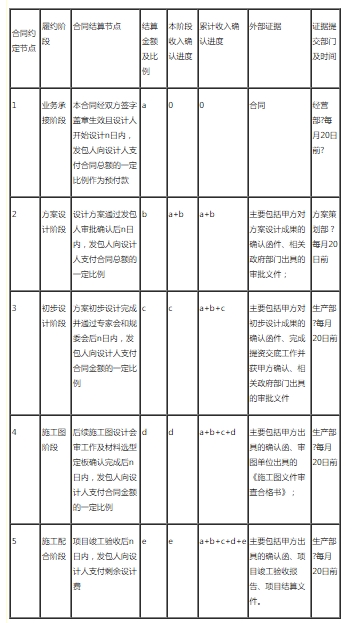 設(shè)計(jì)公司的主要業(yè)務(wù)為建筑設(shè)計(jì)業(yè)務(wù),在完成合同約定的階段性履約義務(wù),向客戶提交設(shè)計(jì)成果并取得成果確認(rèn)文件時(shí),根據(jù)合同約定的對應(yīng)履約階段金額確認(rèn)收入。但在方案階段結(jié)束轉(zhuǎn)施工圖階段并正式開展后才簽訂設(shè)計(jì)合同的情況也存在,這時(shí)需要進(jìn)一步判斷該項(xiàng)目已發(fā)生成本費(fèi)用如何按照收入準(zhǔn)則進(jìn)行相應(yīng)的會計(jì)處理。如果設(shè)計(jì)公司根據(jù)實(shí)際情況判斷該項(xiàng)目最終能簽訂合同并獲得補(bǔ)償,則可按照新收入準(zhǔn)則的規(guī)定以合同履約成本來確認(rèn)在簽訂合同之前已經(jīng)發(fā)生的成本費(fèi)用。如果設(shè)計(jì)公司最終沒能與客戶簽訂合同,且前期發(fā)生成本不能得到任何補(bǔ)償,則需要將該項(xiàng)目發(fā)生的相關(guān)支出予以費(fèi)用化處理。 1、根據(jù)合同節(jié)點(diǎn)及其收款金額確認(rèn)分階段收入金額。本公司在業(yè)務(wù)承接階段收取的預(yù)收款項(xiàng),不確認(rèn)收入。